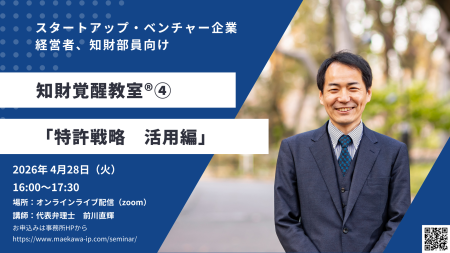 スタートアップ・ベンチャー企業経営者・企業知財部員向け、最短1カ月で知財戦略を習得できる「知財覚醒教室®」シリーズ(全4回)の第4回目です。
